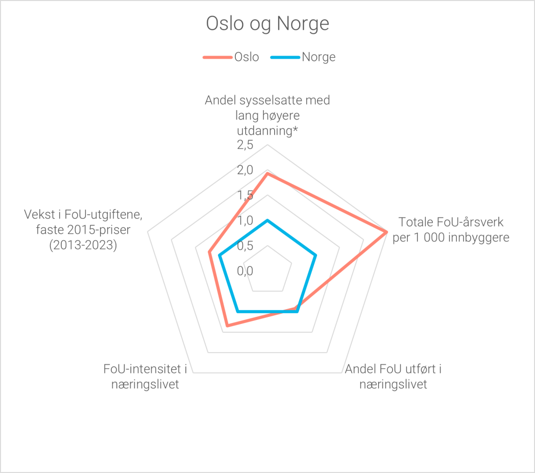 Oslo er fortsatt det største fylket målt i FoU-aktivitet, og står for nær en tredjedel av FoU-utgiftene i Norge. I Oslo er det et FoU-intensivt næringsliv, særlig innenfor tjenesteytende næringer, som står for den største andelen. Men også universitets- og høgskolesektoren, som også inkluderer Oslo universitetssykehus HF, har en stor andel FoU i Oslo. Universitetet i Oslo og andre store utdanningsinstitusjoner som OsloMet og Handelshøyskolen BI bidrar til den høye andelen. I alt 7 vitenskapelige høgskoler og 4 andre høgskoler, av totalt 23 høgskoler som inngår i universitets- og høgskolesektoren, er lokalisert i Oslo. I instituttsektoren er det særlig SINTEF, Norges geotekniske institutt, Norsk institutt for vannforskning og Folkehelseinstituttet som bidrar til den høye FoU-aktiviteten i hovedstaden.