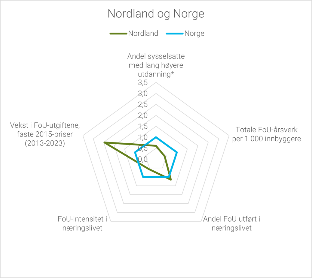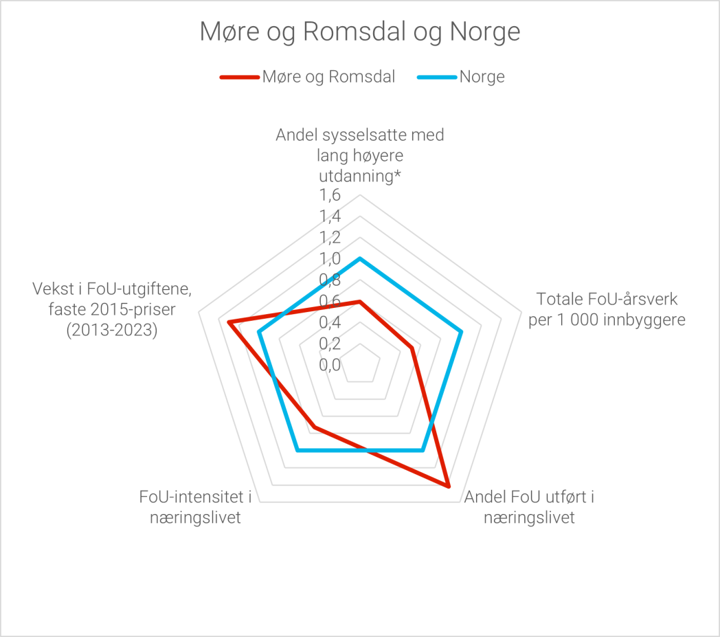 FoU-aktiviteten er ikke like høy i alle fylker i Norge. Nordland, Innlandet og Møre og Romsdal er fylkene med lavest andel av Norges samlede FoU-aktivitet. Alle disse fylkene hadde en andel på om lag 2 prosent hver av den samlede FoU-aktiviteten i Norge i 2023. Figur 1.6b viser også at disse tre fylkene, sammen med Agder, har lavest FoU-aktivitet målt i FoU-utgifter per innbygger.